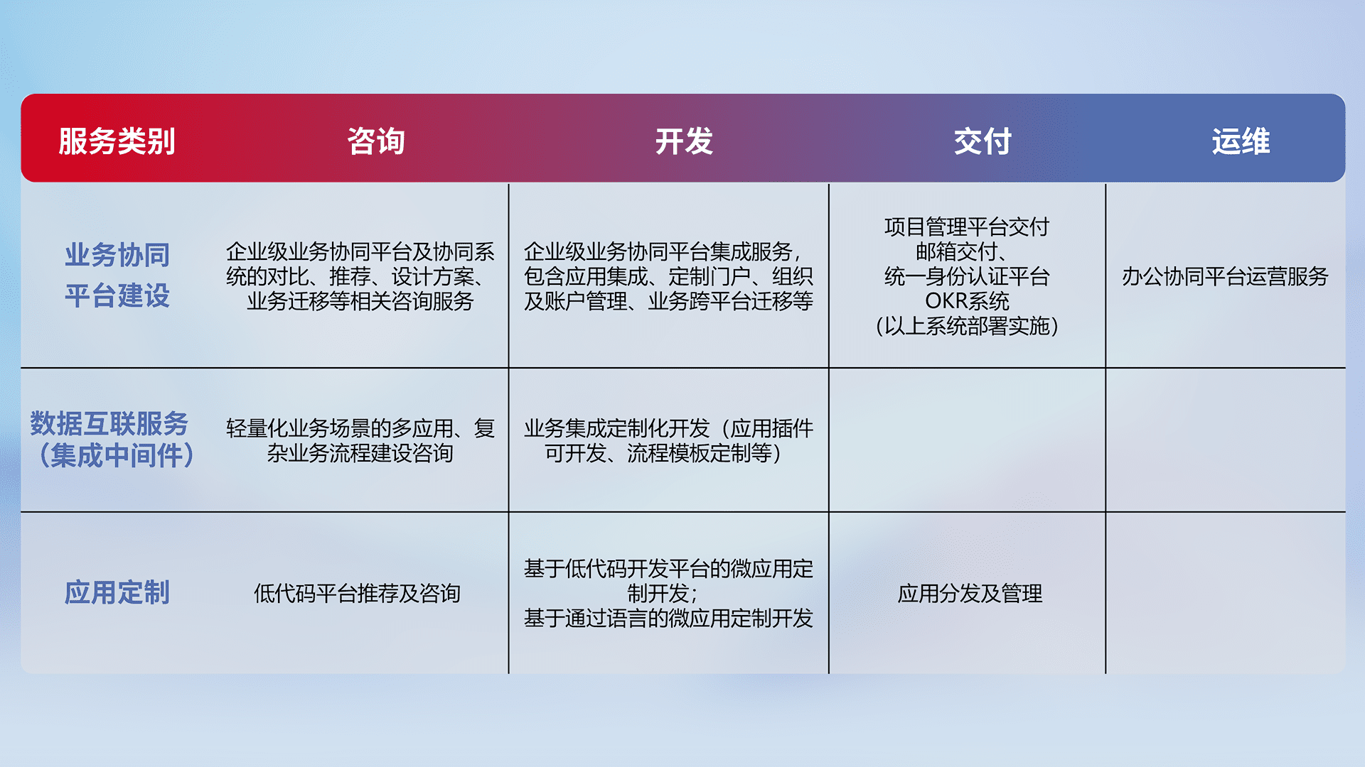 针对钉钉、、企微、、、IDaas等平台级产品提供产品的规划、、、、方案、、、、交付、、、、定制化开发等服务,,实现如统一协同办公、、智能客户服务、、、混合会议管理、、、智能数据查询、、、等业务场景,,,实现数字化转型。。